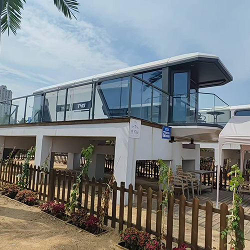 在主題公園中,太空艙移動房屋可以作為特殊的住宿設施,里面臥室、盥洗間、淋浴間、衛(wèi)生間、活動間精巧布置,門窗、燈飾、窗簾、電視均為智能化聲控。透過玻璃鋼幕墻室外風景一覽無余,為游客提供獨特的住宿體驗,讓他們感受到與眾不同的旅行樂趣。